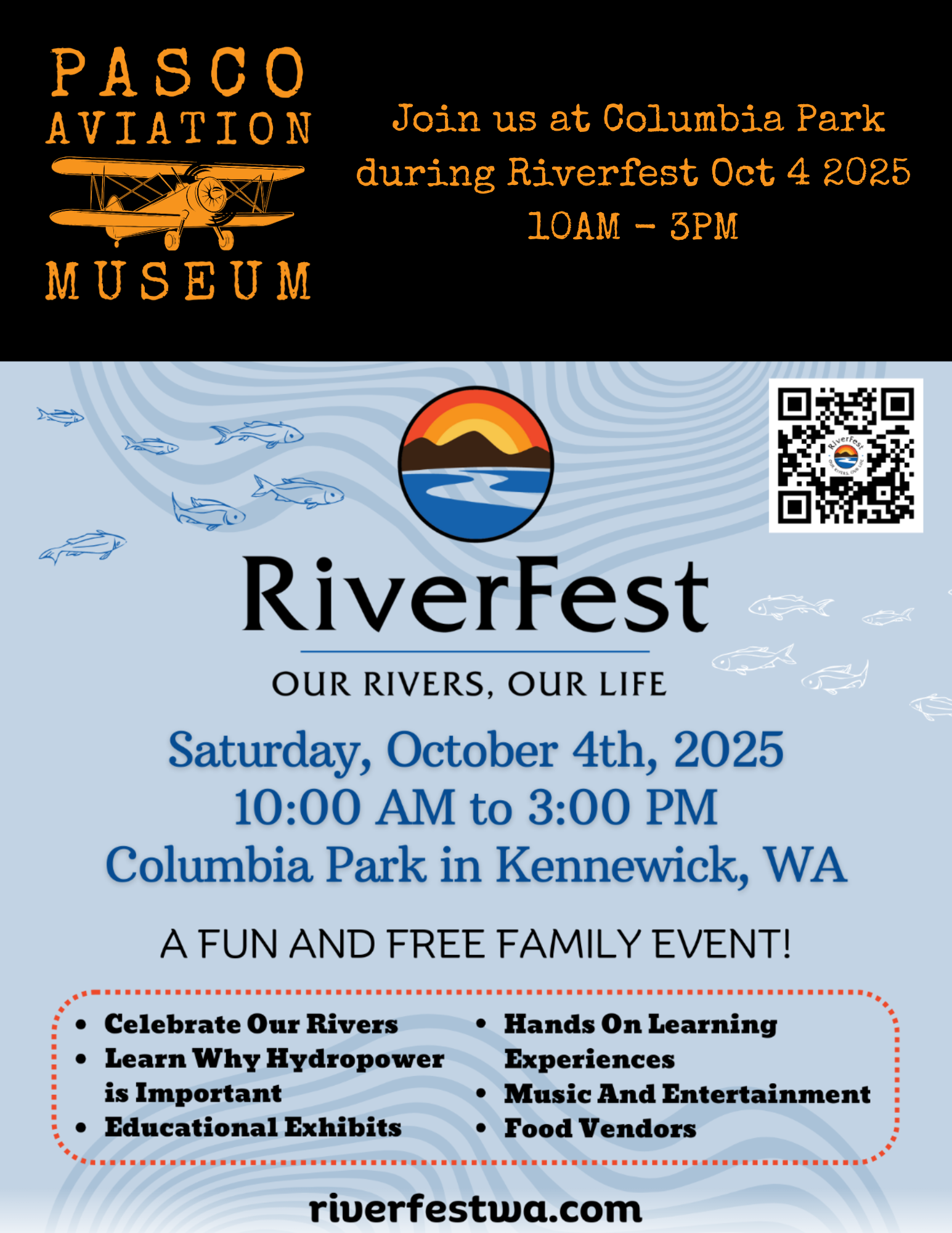 The Pasco Aviation Museum invites you to visit our booth at RiverFest October 8, 2022. Learn about our aviation history, our rivers, our dams and their importance to our community. #RiverFest Saturday October 8th 10am-3pm Columbia Park. #pascoaviationmuseum “THE MUSEUM WILL ALSO BE OPEN 10-4”